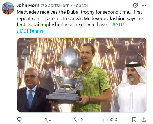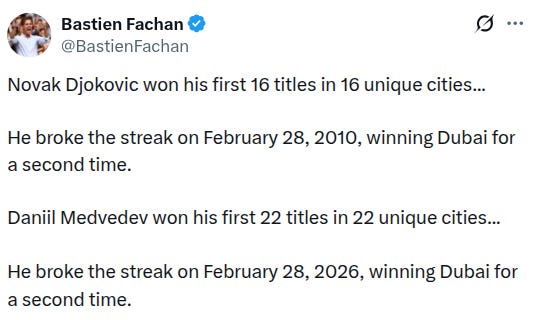 Medvedev’s Dubai title this weekend ended our favorite stat in tennis. Up until then, he had never won a tournament in the same city twice. All 22 of his titles had come in different locations.