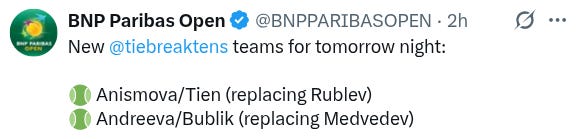 The Eisenhower Cup mixed doubles exhibition—not to be confused with the tournament’s official mixed doubles draw—will air on Tennis Channel starting at 10 p.m. ET. It’s similar to (and predates) the US Open’s popular mixed-doubles tournament last year, featuring teams of top-ranked singles players in an abbreviated format. Here, each match is a 10-point tiebreak. The winners will split $200,000. Here’s the field, and we’ll be in the live chat during the action.