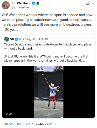 Davidov’s father has offered a couple of reasons for developing Teo’s ambidextrous style. At one point, Teo injured his dominant wrist and trained with the other hand while it healed. He has worked with Patrick Mouratoglou for several years.