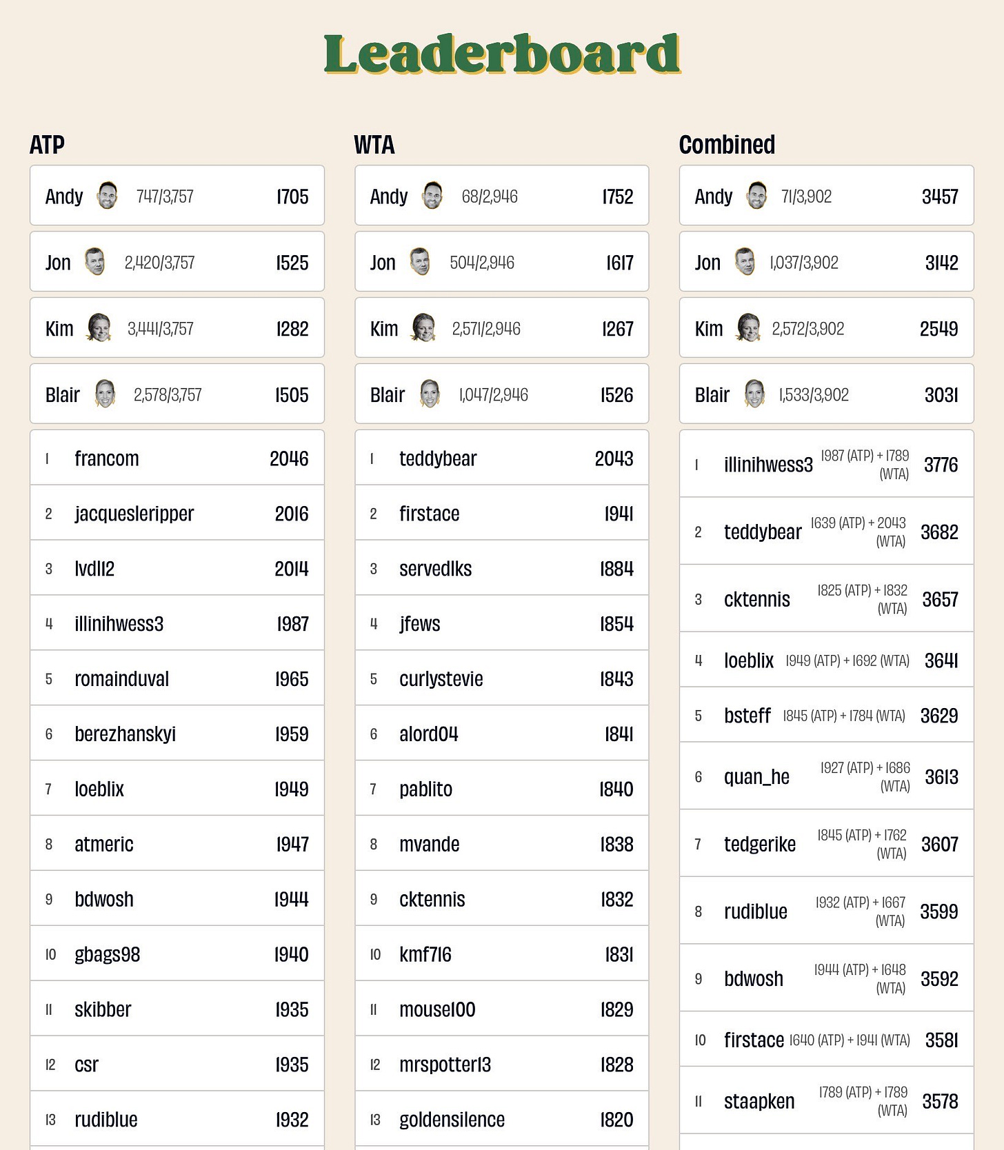 With 207 points still available in the Served Bracket Challenge (100 for each final and seven bonus points in seed differential), 13 Chuckers are still alive going into the finals.