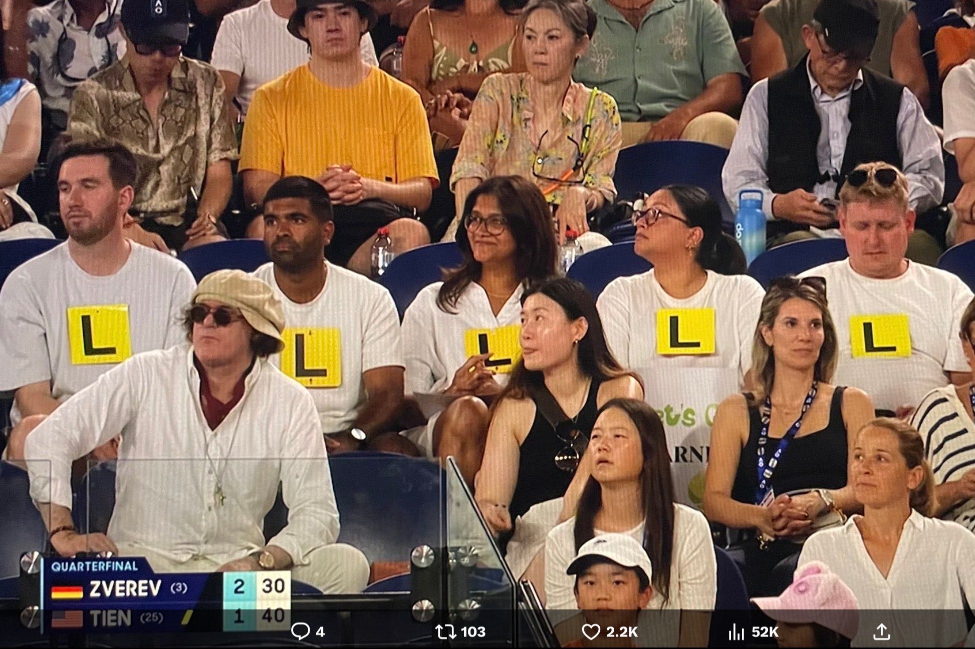 This year, fans honored Tien with a quirky tribute—wearing yellow L-plates, a mandatory card that signifies “learning driver” in Australia.
