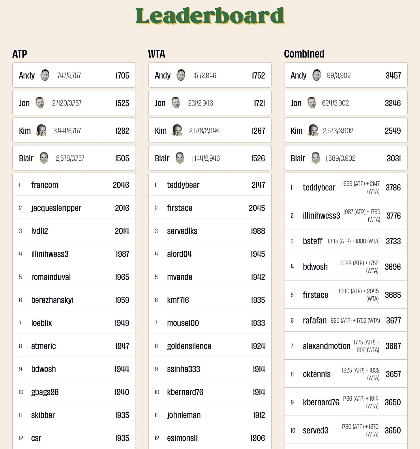 Despite not picking the winner, Andy beat the Served team with 1,752 points, pulling off a win over JW (1,721), who correctly predicted Rybakina. Andy finished in 151st place and JW landed at 231.