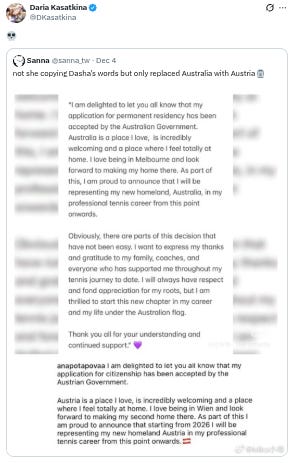 Potapova’s announcement rang a bell to some fans. They compared it to Kasatkina’s in March, and lo and behold, it matched nearly word for word, with Australia changed to Austria. The blunder caught Kasatkina’s attention.