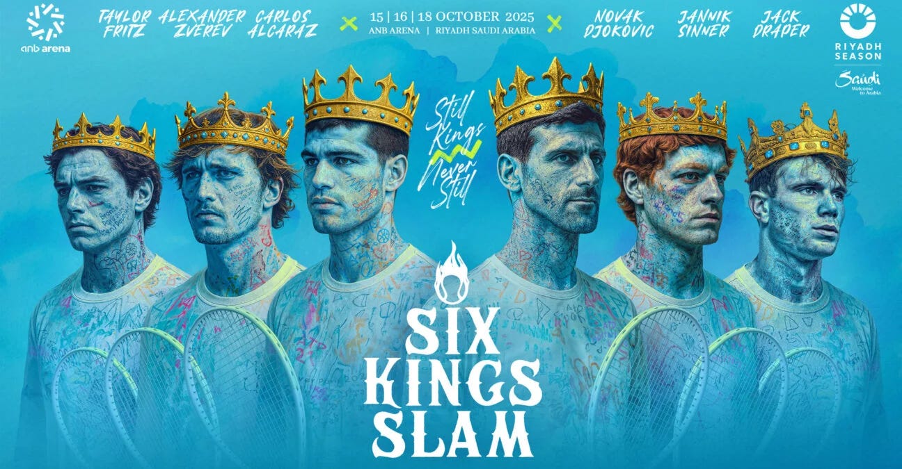 The Six Kings Slam is returning to Saudi Arabia this October. Novak Djokovic, Jannik Sinner, and Carlos Alcaraz are back in the field, with Alexander Zverev, Taylor Fritz, and Jack Draper joining the trio.